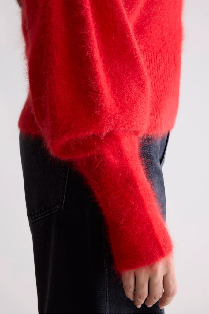 Zachte gebreide trui met ronde hals en lange mouwen, in een rode angoramix.