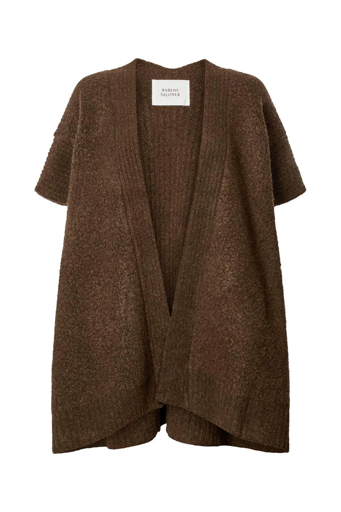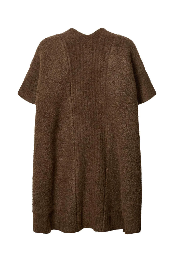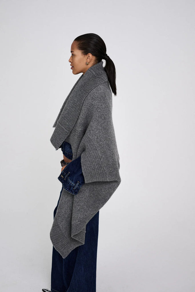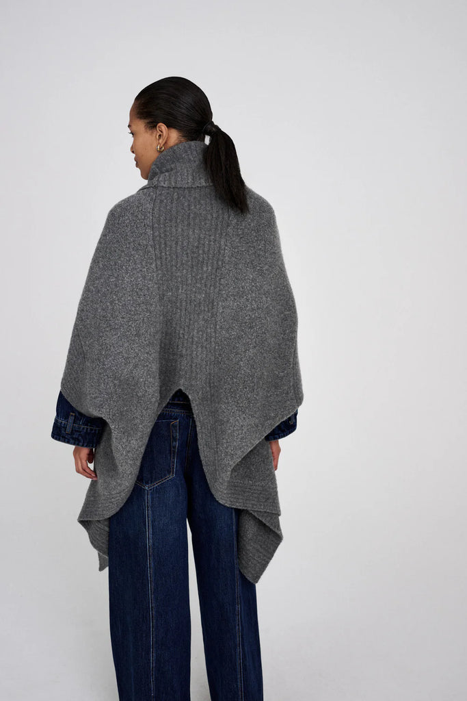 Crafted from a soft, pleasant woolen fabric, the stylish knit cape is defined by an oversized, boxy silhouette with ribbed details and a split in the back.