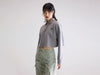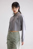 Cropped polo met rits in heidegrijze neopreenachtige stof, met een kraag in polostijl.